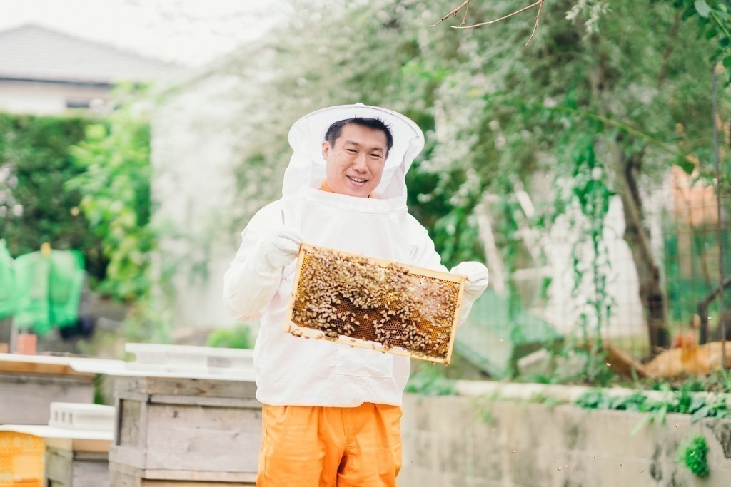 庭に巣箱を置き、ミツバチと寄り添って生きています。